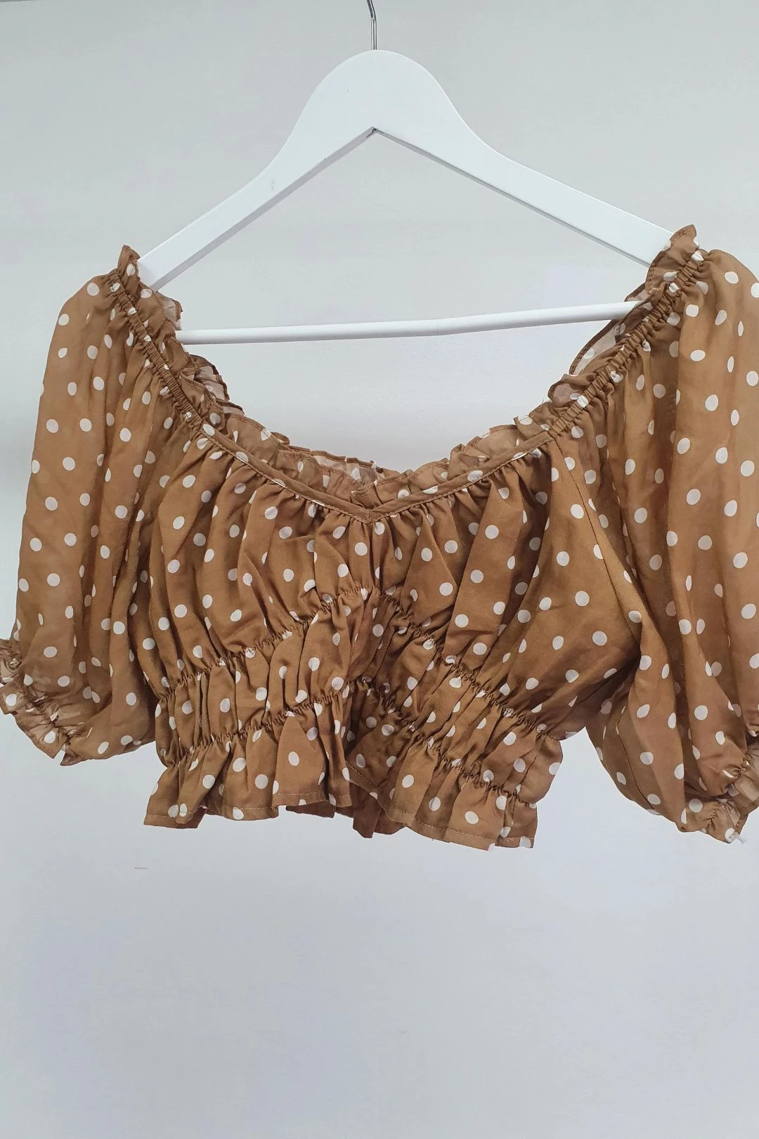 The Abby Tan Polka Top by Ownley features an elasticated neckline, bodice, and sleeves, and is crafted from lightweight fabric. Perfect for date night!
