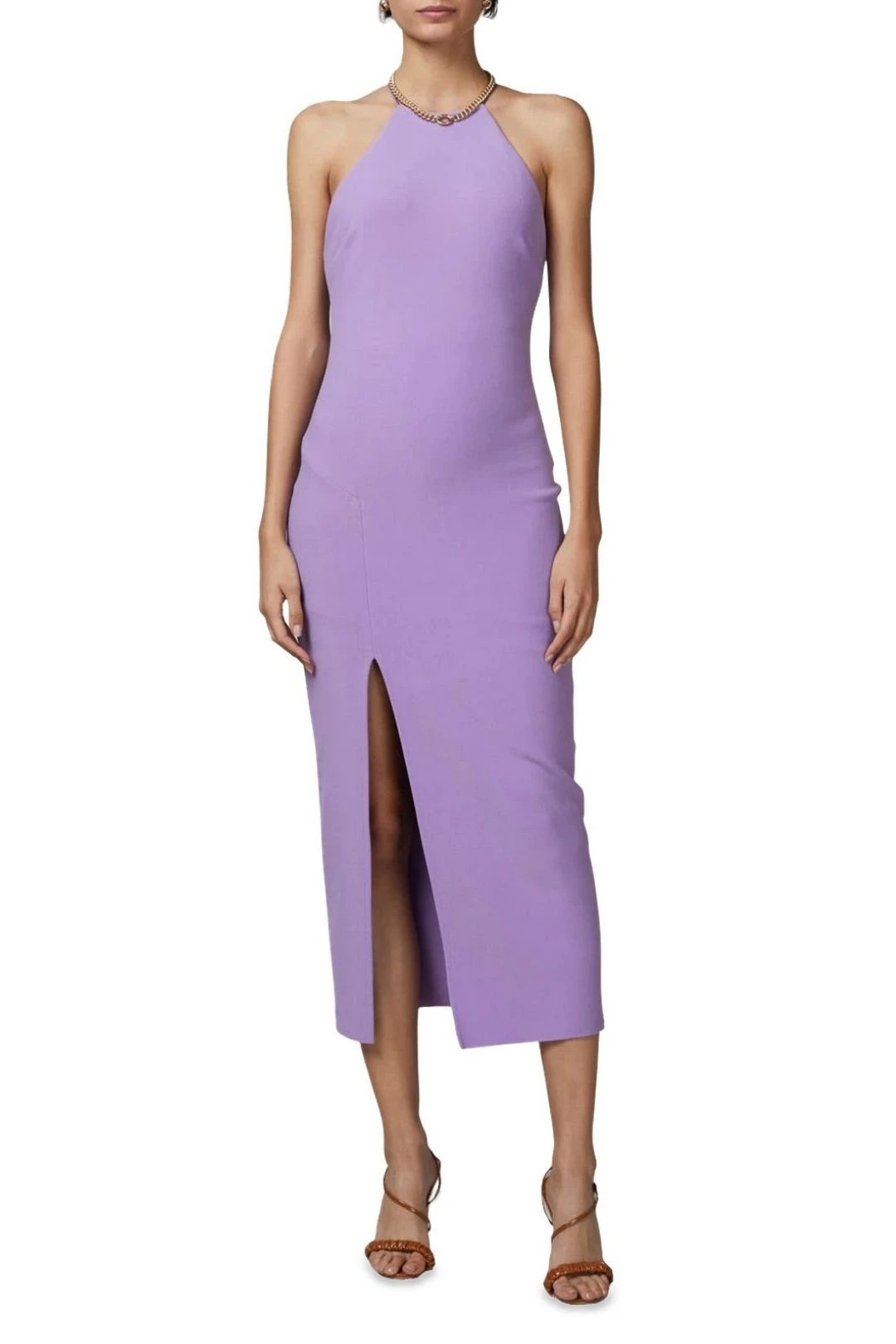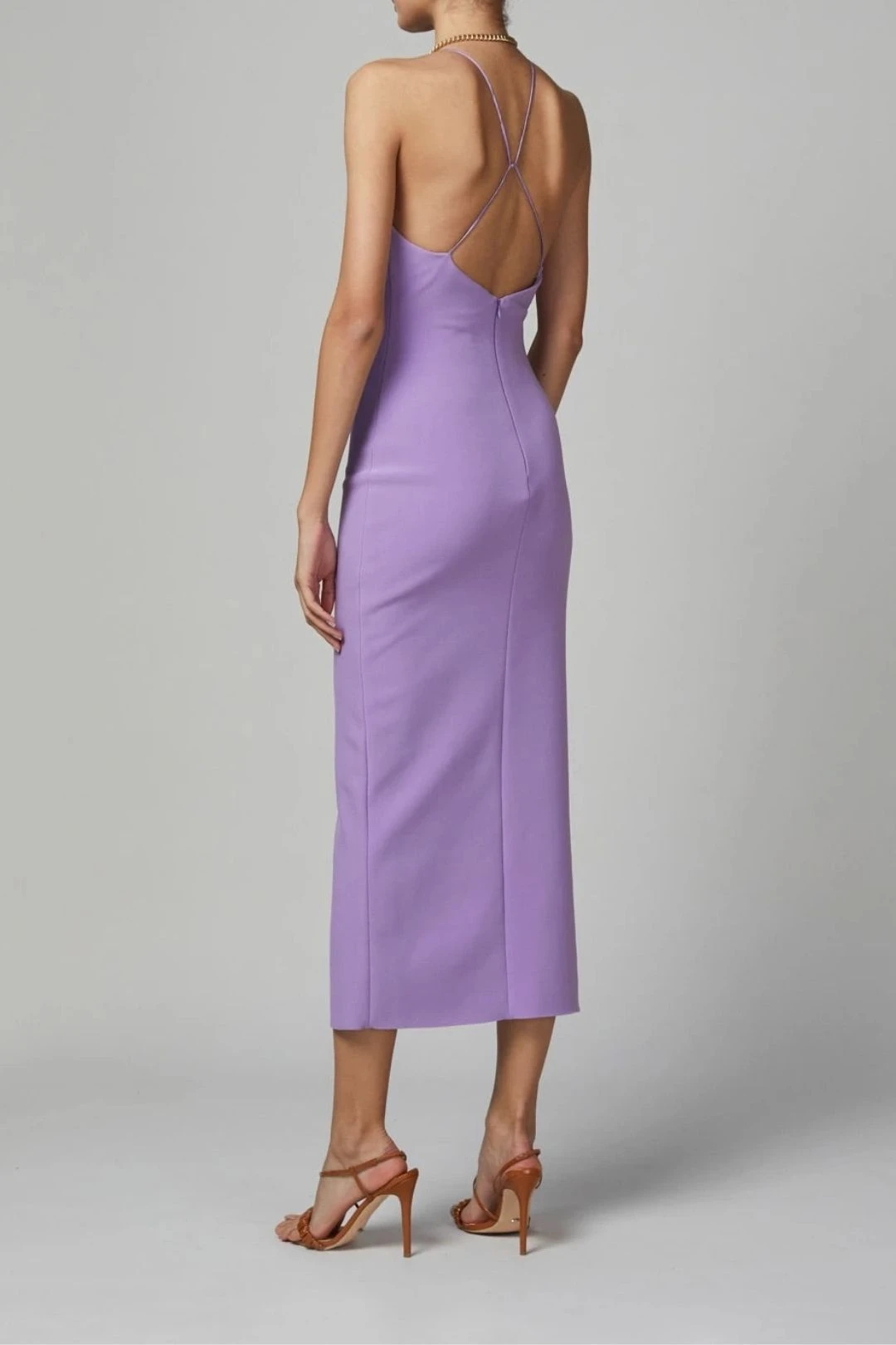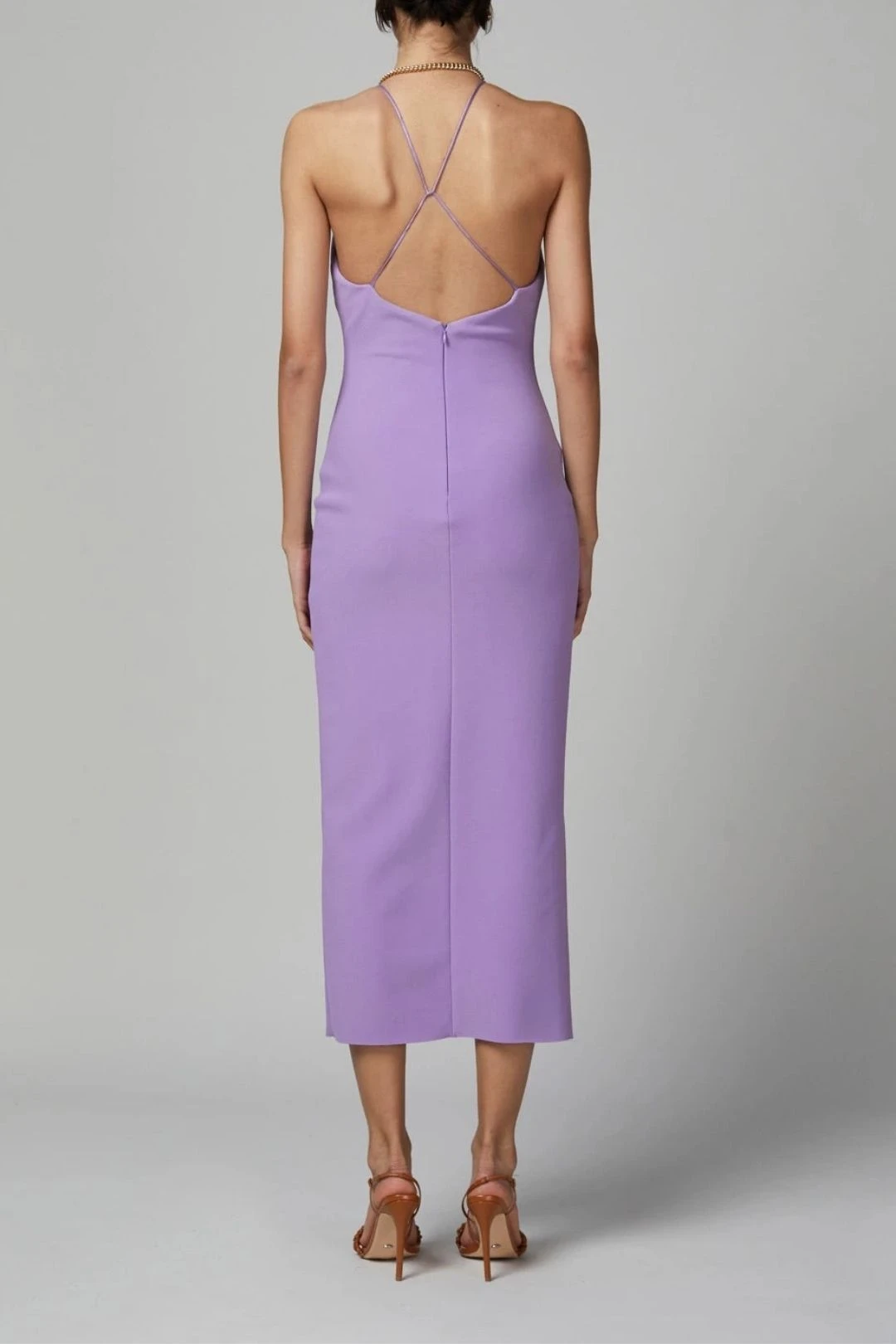 The Candy Midi Dress has a high neckline, a low cut-out back with thin cross-over straps, and a sexy thigh-high split. Perfect for an upcoming summer wedding!