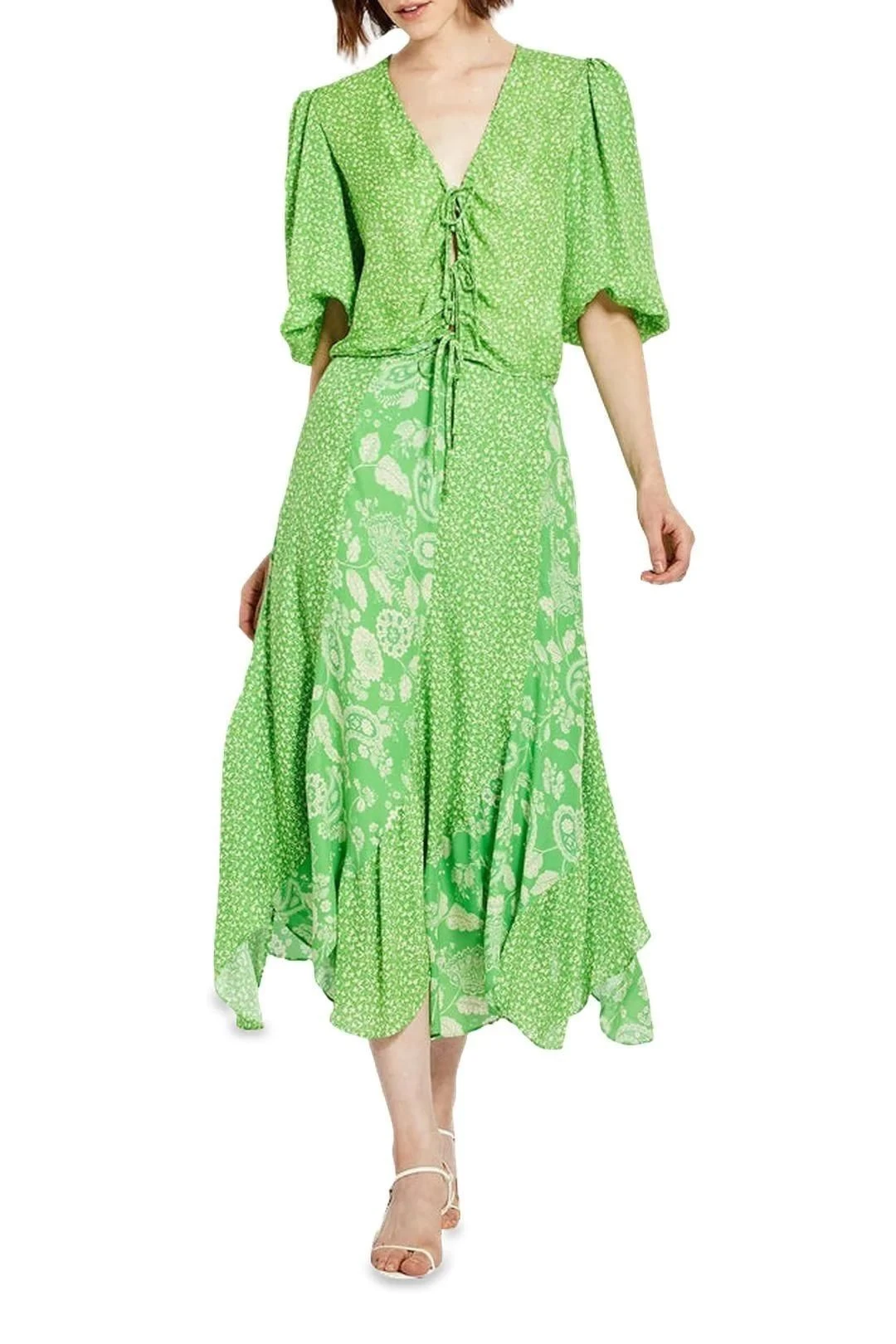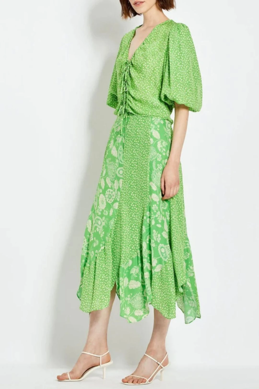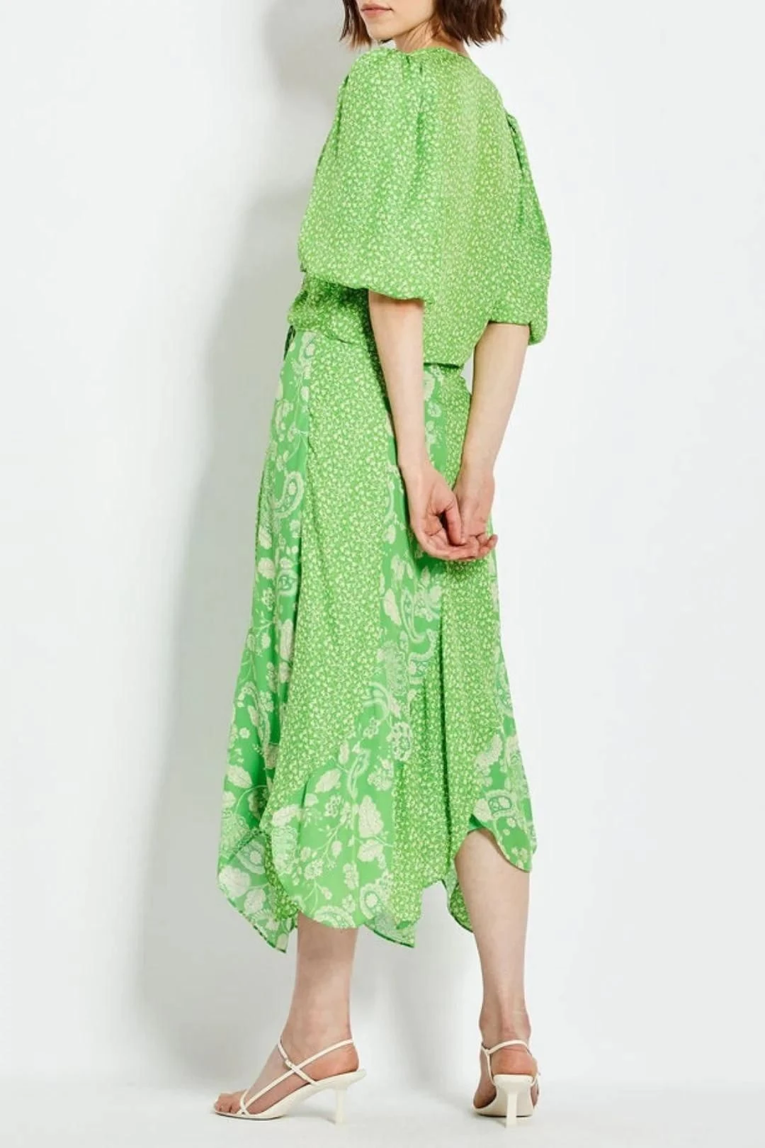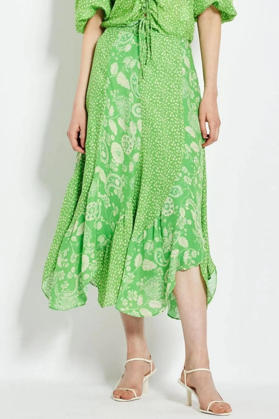 The Debbie Skirt by Nicholas is accented with paisley floral print on vivid green and features a stunning asymmetric hemline. It is perfect to wear to a daytime event.
