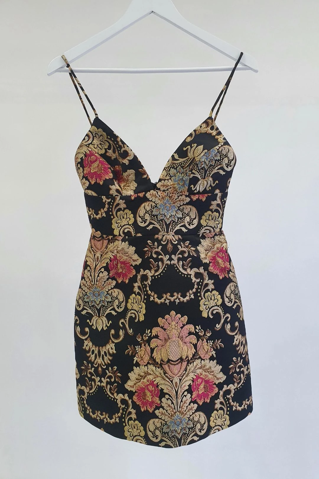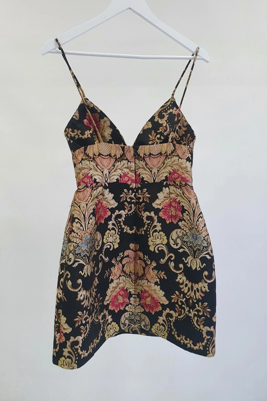 This stunning dress is crafted out of detailed jacquard and features a feminine fit and flare silhouette with delicate shoestring straps and a wide waistband.
