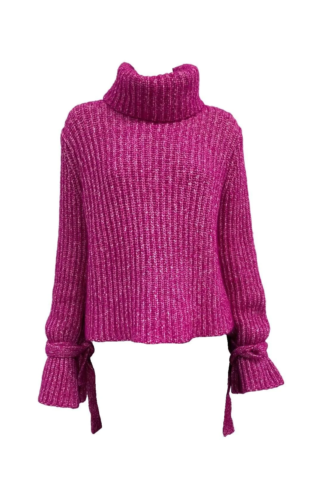 Switch up your look with the Pink Roll Neck Ribbed Sweater by Scanlan Theodore. For a chic cooler vibe, pair this sweater with leather pants and black heels.