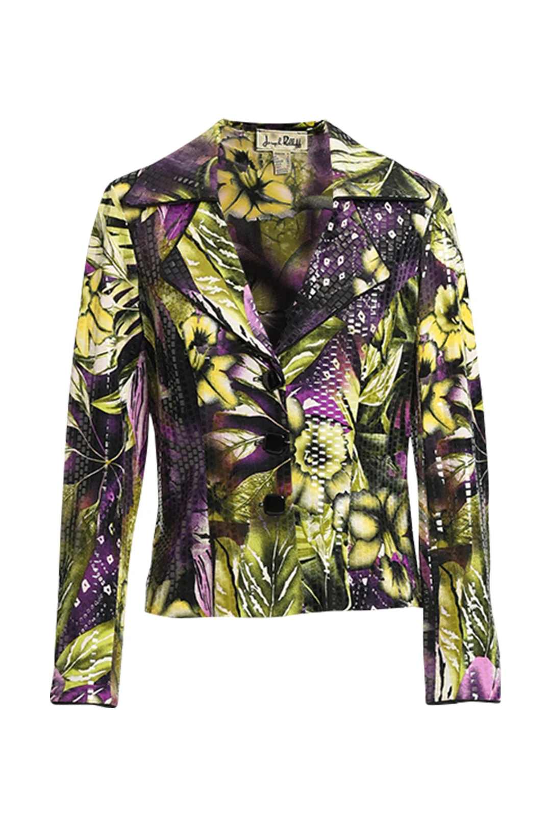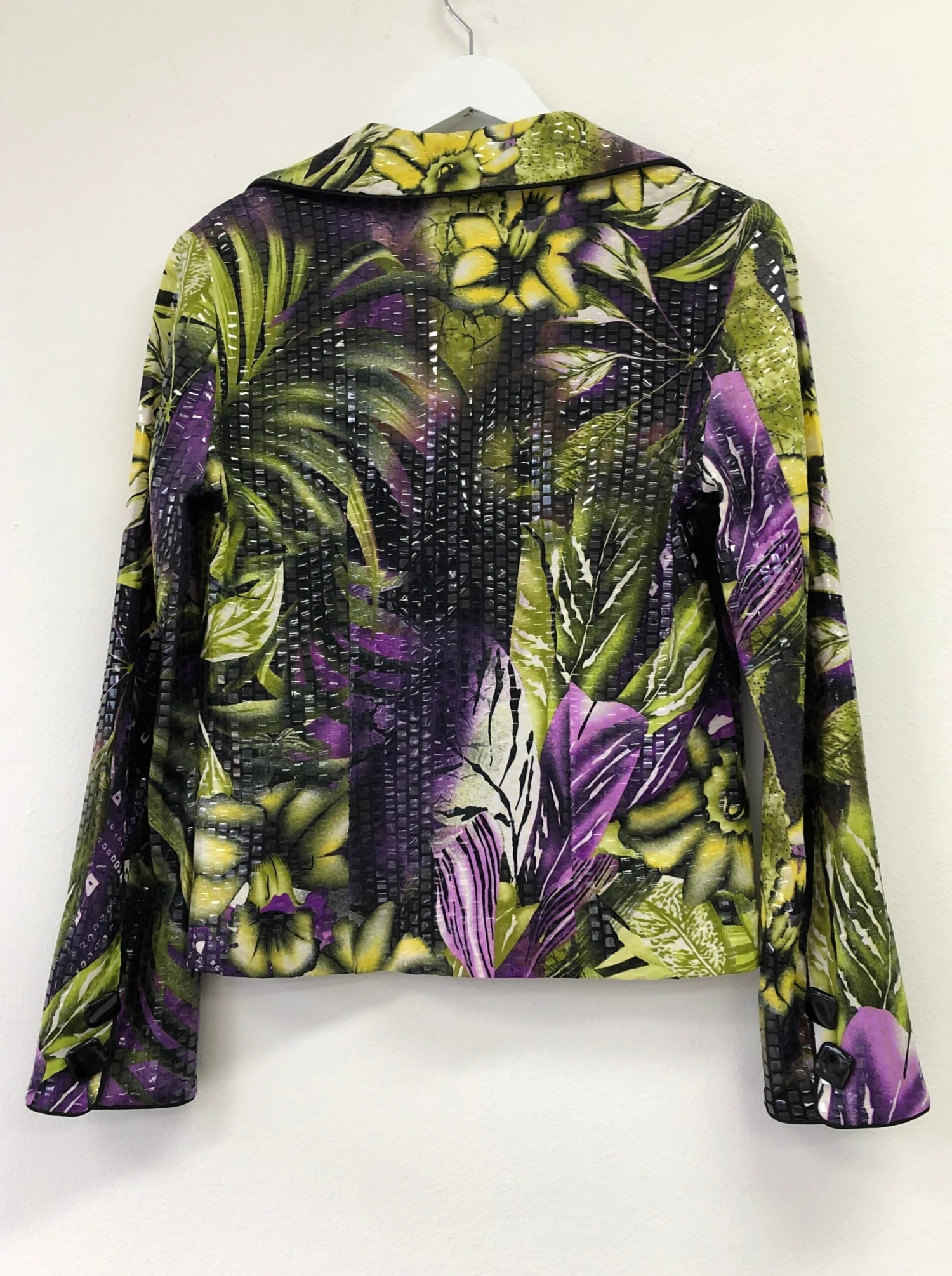 Step up your outerwear game this season with the Purple & Green Floral Jacket by Joseph Ribkoff. It features clear appliques all over to add a shiny stylish, high-class look, finished off with front statement buttons.