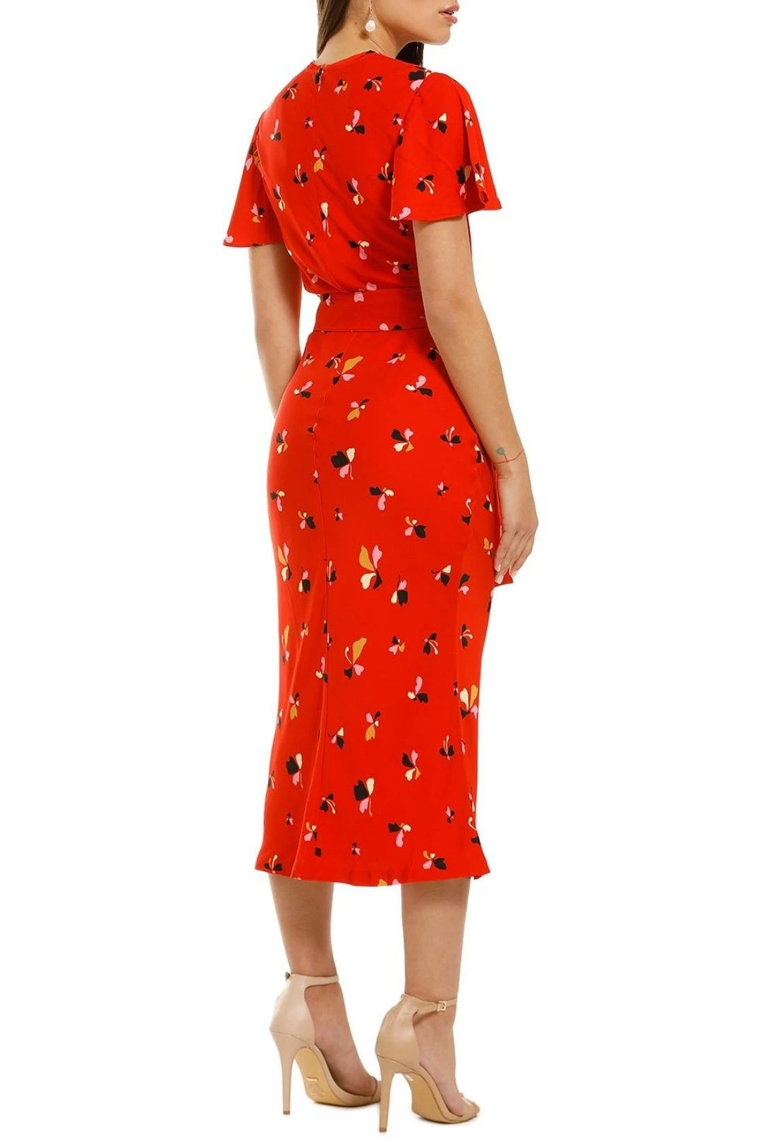 Stand out from the crowd in this vibrant red Ruby SS Midi Dress by Rebecca Vallance. This stylish dress is perfect for your next wedding event!