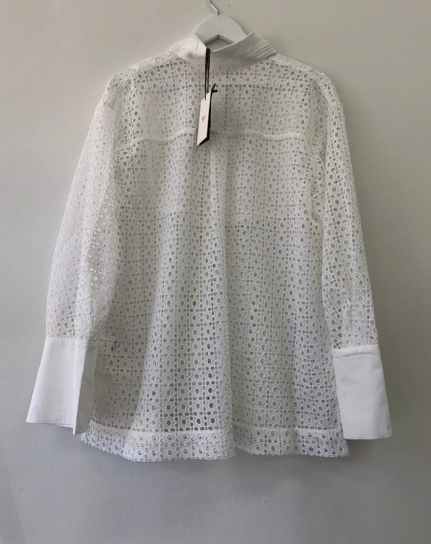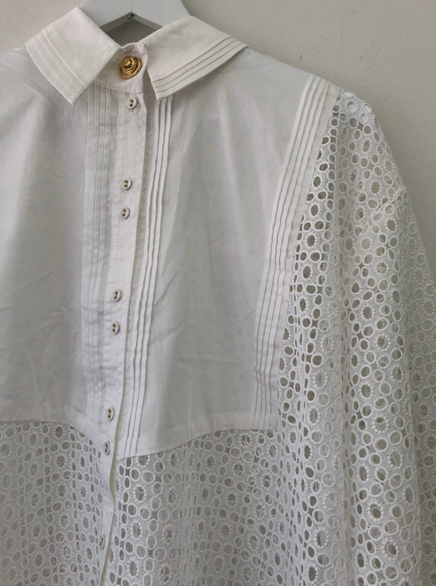 The Valerie Broderie Shirt by AJE is imagined in a classic shirt silhouette featuring a bib detail with pintucks. This lace piece is perfect to wear with denim shorts and leather sandals for a simple French chic look.